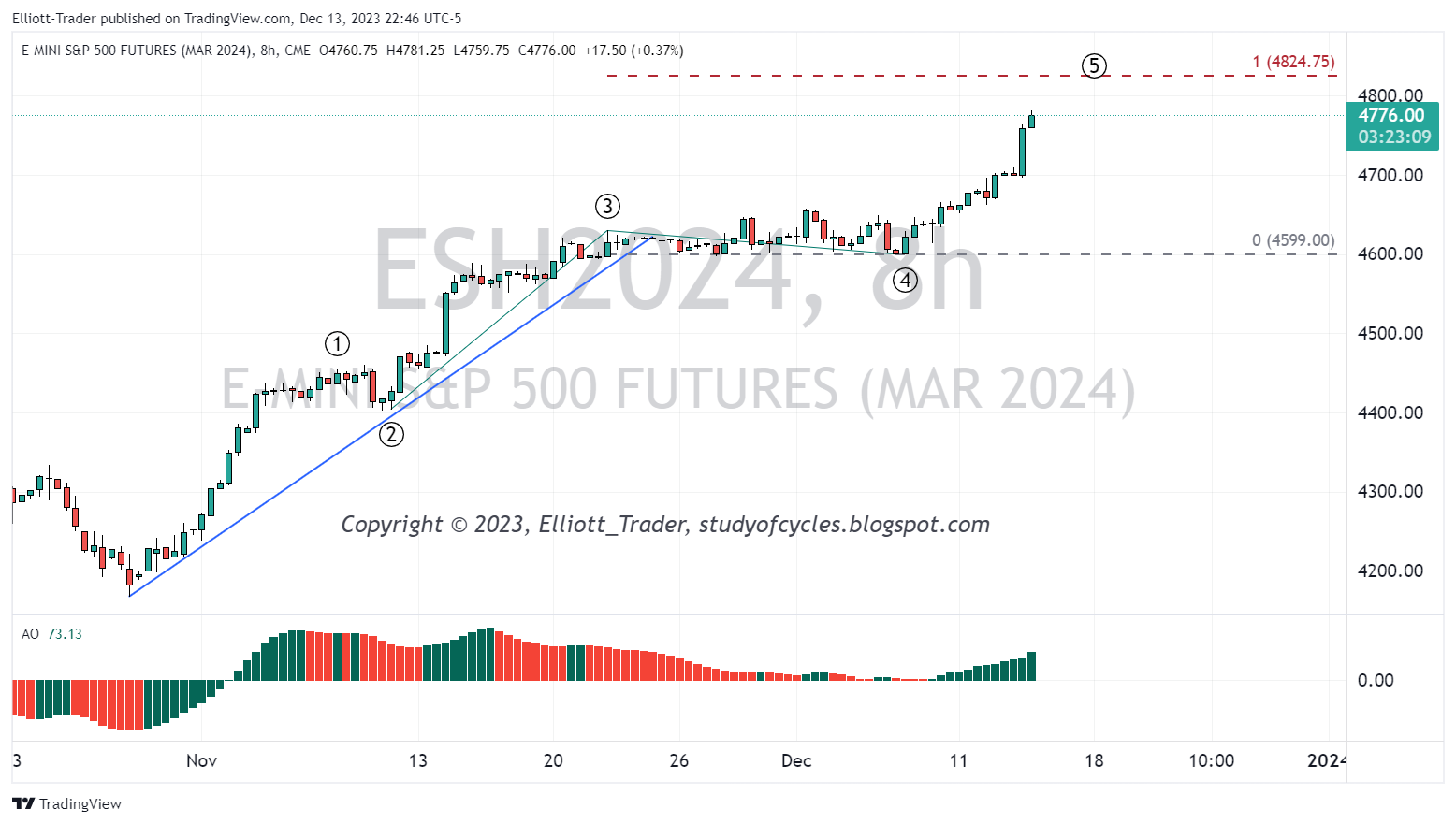 The Fibonacci Five rules were applied above. What does this imply for the current wave upward since the recent October low?